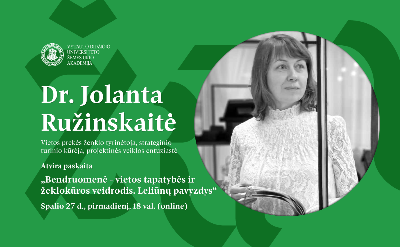Spalio 27 d. 18 val. kviečiame dalyvauti vietos prekės ženklo tyrinėtojos, strateginio turinio kūrėjos, projektinės veiklos entuziastės dr. Jolanta Ružinskaitės atviroje paskaitoje „Bendruomenė – vietos tapatybės ir žeklokūros veidrodis. Leliūnų pavyzdys“.