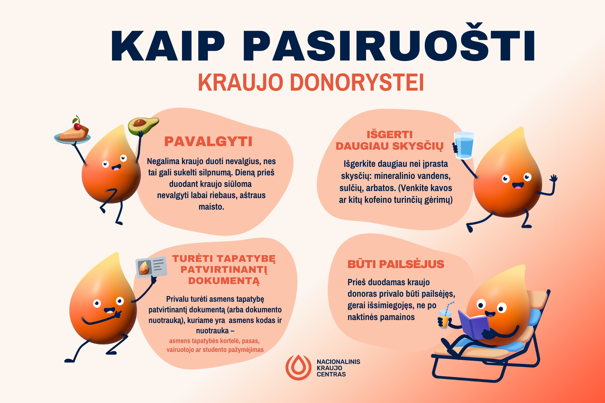Trumpa informacija apie pasiruošimą donorystei bei anketa, kurią galima atvykti jau iš anksto užsipildžius (jų turėsime ir su savimi), taip pat galima jas pildyti “Mano kraujas” programėlėje.