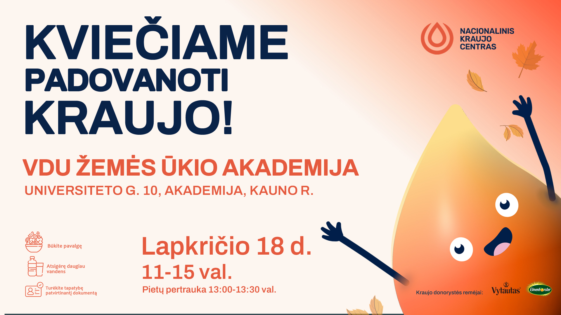 Lapkričio 18 d. 11.00–15.00 val. Vytauto Didžiojo universiteto Žemės ūkio akademijoje (VDU ŽŪA) vyks Nacionalinio kraujo centro vykdoma kraujo donorystės akcija. Kviečiame prisidėti studentus ir darbuotojus. Kiekvienas donoras – labai svarbus, galintis kitam dovanoti sveikatą ar net gyvybę.