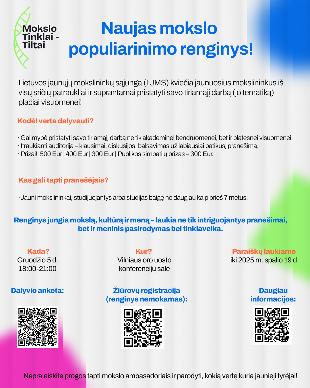 Gruodžio 5 d. 18:00 val. Lietuvos jaunųjų mokslininkų sąjunga (LJMS) kviečia dalyvauti naujame mokslo populiarinimo renginyje „Mokslo tinklai–tiltai“.
