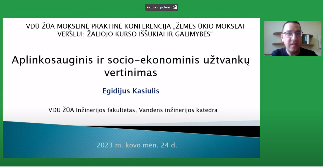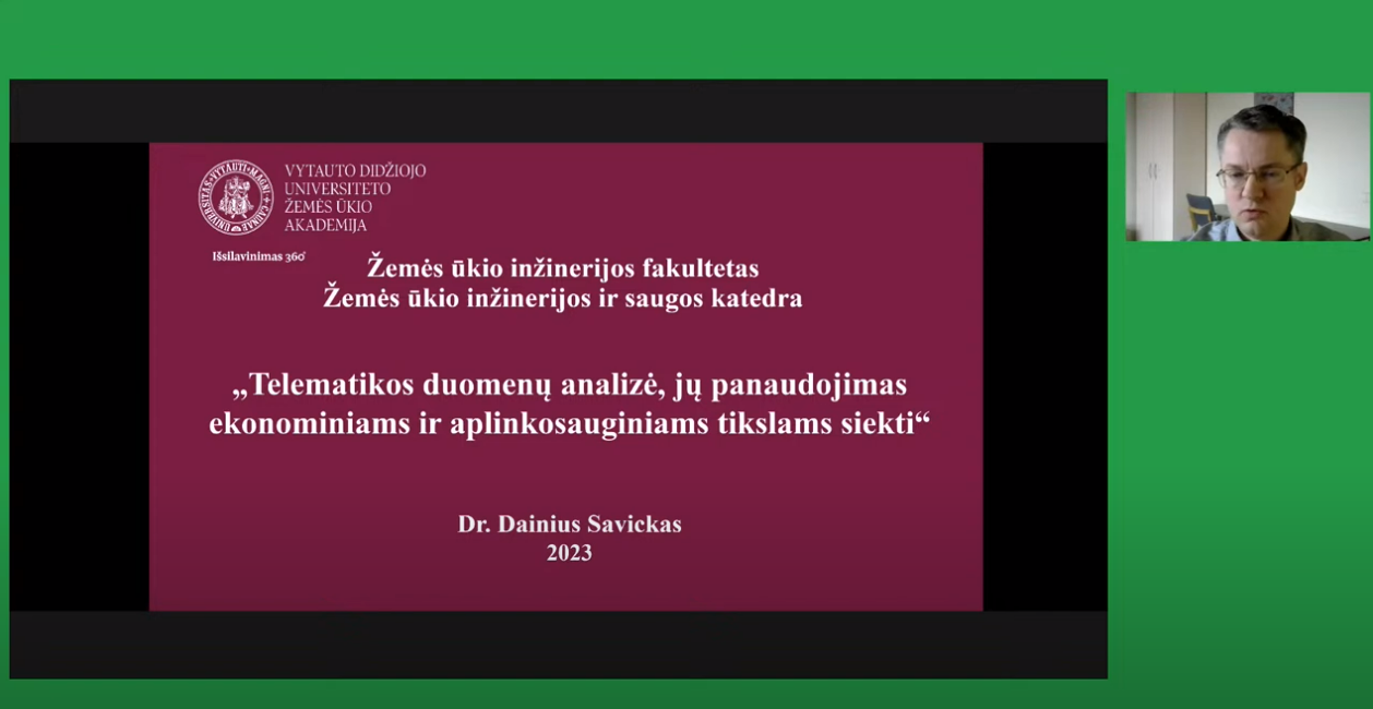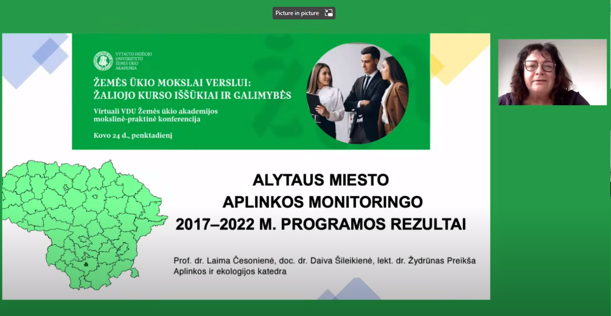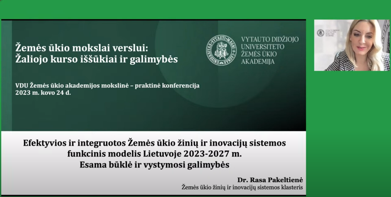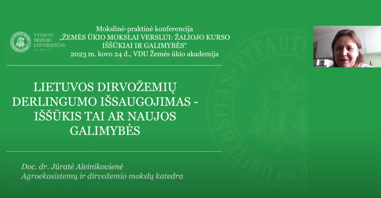 Konferencijos „Žemės ūkio mokslai verslui: Žaliojo kurso iššūkiai ir galimybės“ praktine ašimi šiemet pasirinktos įvairios Europos žaliojo kurso tikslų siekti padedančios mokslininkų išgvildentos temos. VDU ŽŪA Agronomijos fakulteto Agroekosistemų ir dirvožemio mokslų katedros doc. dr. Jūratė Aleinikovienė kalbėjo apie Lietuvos dirvožemių derlingumo išsaugojimo svarbą, Inžinerijos fakulteto Žemės ūkio inžinerijos ir saugos katedros atstovas lekt. dr. Dainius Savickas – apie telematikos duomenų analizę, jų panaudojimą ekonominiams ir aplinkosauginiams tikslams siekti, Miškų ir ekologijos fakulteto Miško mokslų katedros atstovai dr. Justas Mingaila, prof. dr. Edmundas Bartkevičius, prof. habil. dr. Vladas Vilimas kalbėjo apie beržų sulos verslo galimybes, Bioekonomikos plėtros fakulteto Verslo ir kaimo plėtros vadybos katedros atstovai doc. dr. Jolita Greblikaitė, lekt. Rolandas Rakštys pristatė ūkio konkurencingumo vertinimą, Gyvūnų produkcijos tyrimų ir inovacijų centro vadovė dr. Edita Meškinytė pasakojo apie inovatyvius mėsinių galvijų selekcijos metodus, Inžinerijos fakulteto Vandens inžinerijos katedros docentas dr. Egidijus Kasiulis pristatė aplinkosauginį ir socio-ekonominį užtvankų vertinimą, Miškų ir ekologijos fakulteto Aplinkos ir ekologijos katedros mokslininkai prof. dr. Laima Česonienė, doc. dr. Daiva Šileikienė, lekt. dr. Žydrūnas Preikša atskleidė Alytaus miesto aplinkos monitoringo, atlikto 2017–2022 metais, rezultatus.