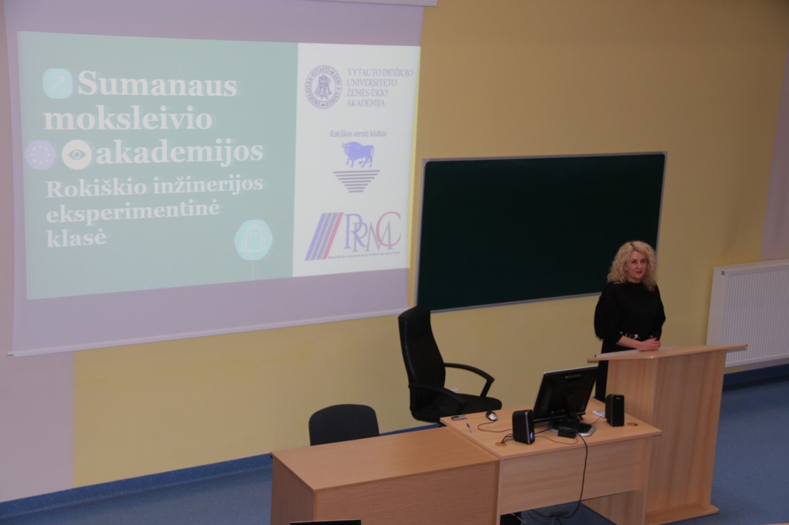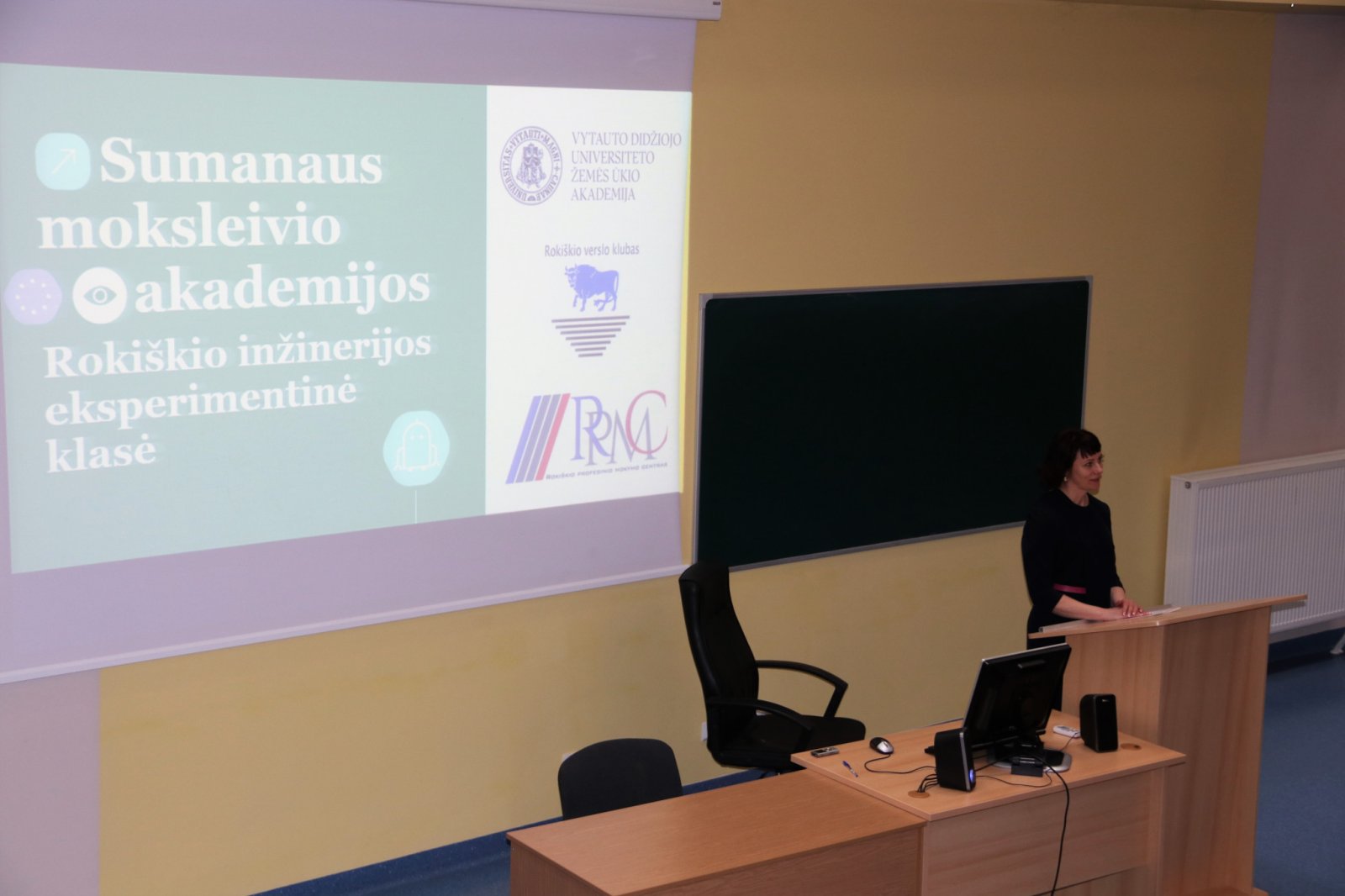 Pastaroji kelionė į užsiėmimus VDU ŽŪA Rokiškio inžinerijos eksperimentinės klasės moksleiviams buvo antroji, tačiau į vieną bendrą būrį jie visi susirinko pirmą kartą, mat pirmąjį susitikimą veiklose dalyvavo pasiskirstę grupėmis. Sveikinimo žodį projekto dalyviams bei iniciatoriams tarusi VDU ŽŪA vicekanclerė prof. dr. Aušra Blinstrubienė dėkojo į Rokiškio verslo klubą susivienijusiems šio rajono verslininkams už Lietuvoje unikalią iniciatyvą sutelkti verslo ir mokslo atstovus dalijantis profesine patirtimi vesti jaunąją kartą žinių keliu. „Linkiu būti ieškančiais ir atrandančiais, turinčiais tikslą bei gebančiais susirasti teisingą kelią šiam tikslui įgyvendinti“, – kalbėjo A. Blinstrubienė, sveikindama prie VDU ŽŪA bendruomenės prisijungusius Rokiškio inžinerijos eksperimentinės klasės moksleivius.
