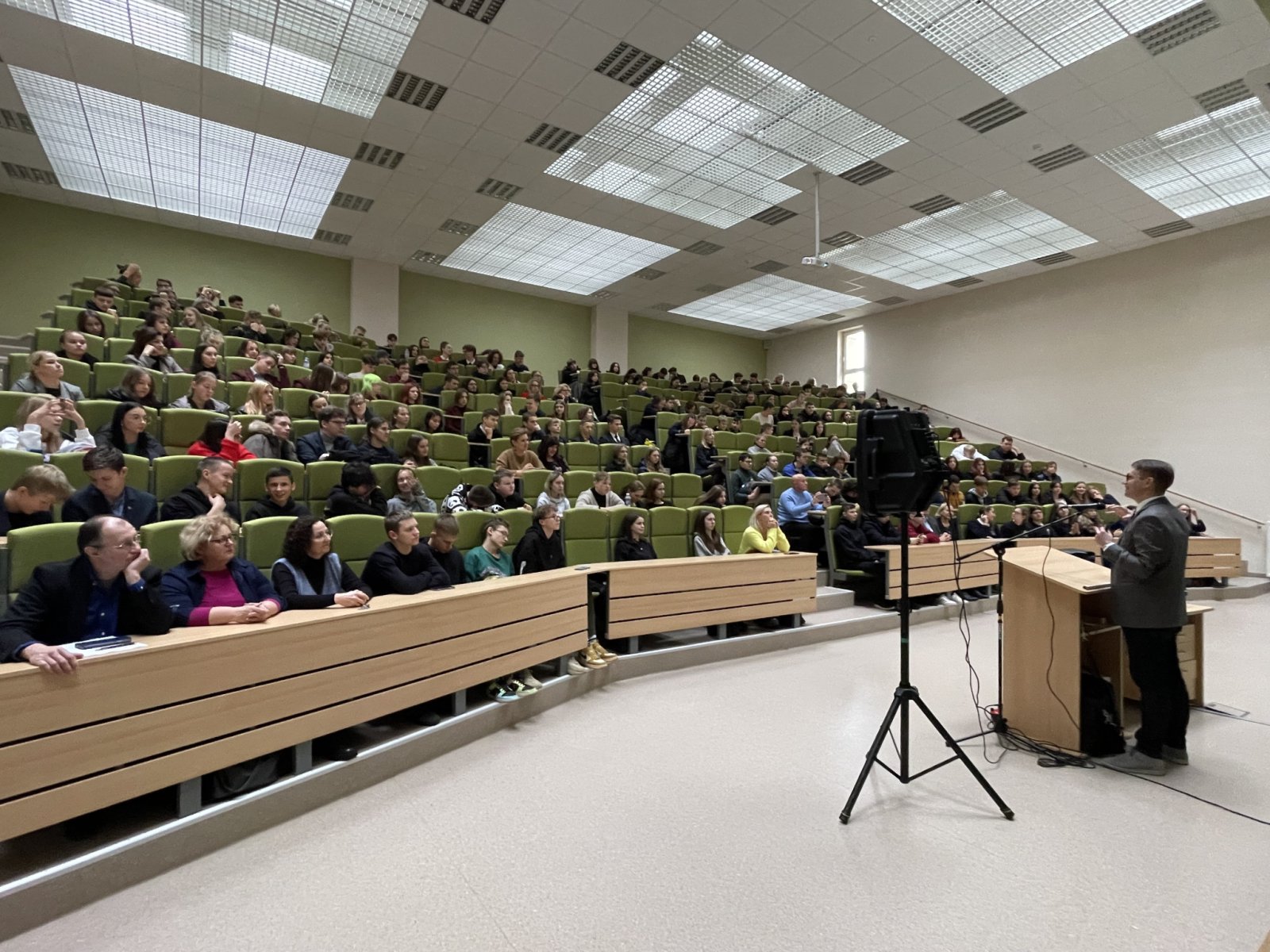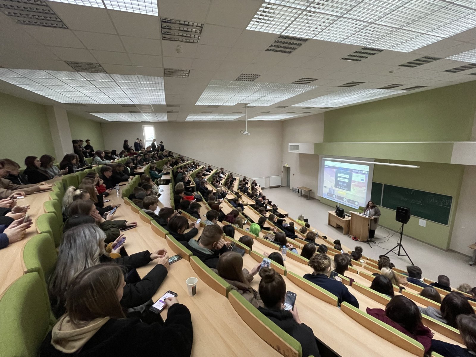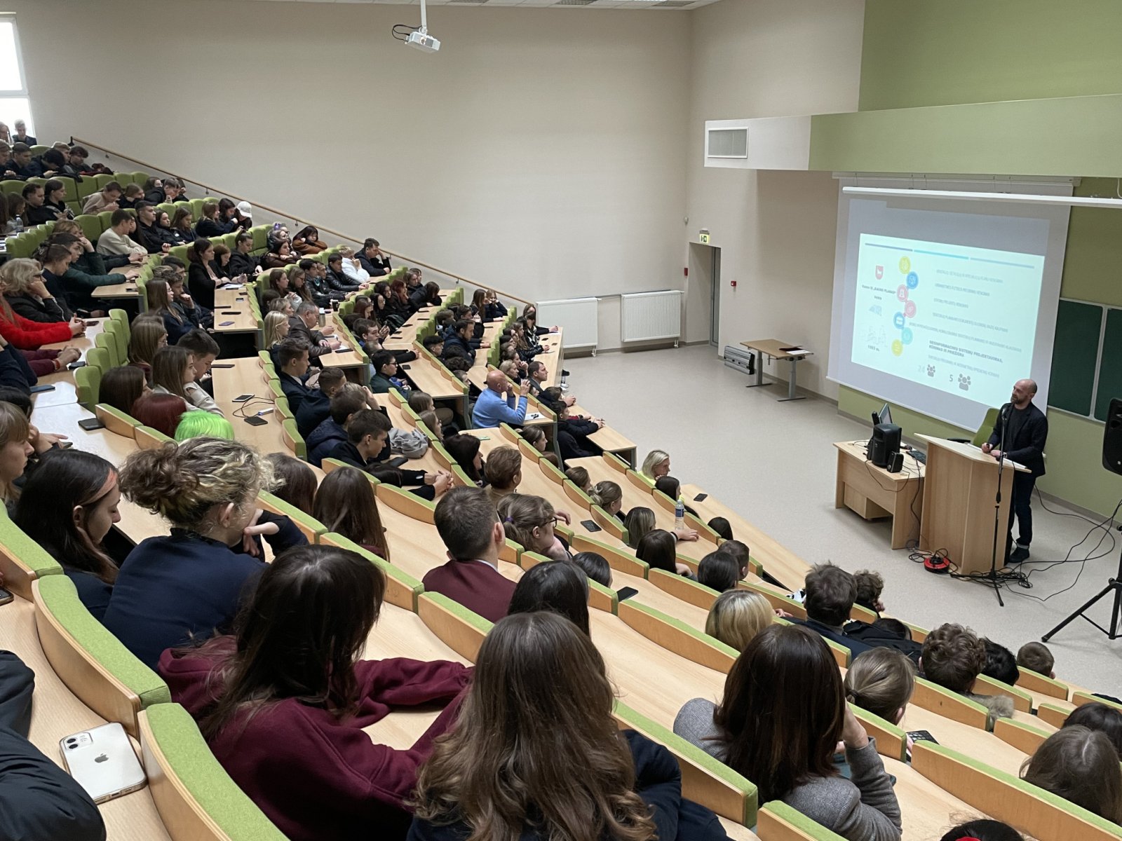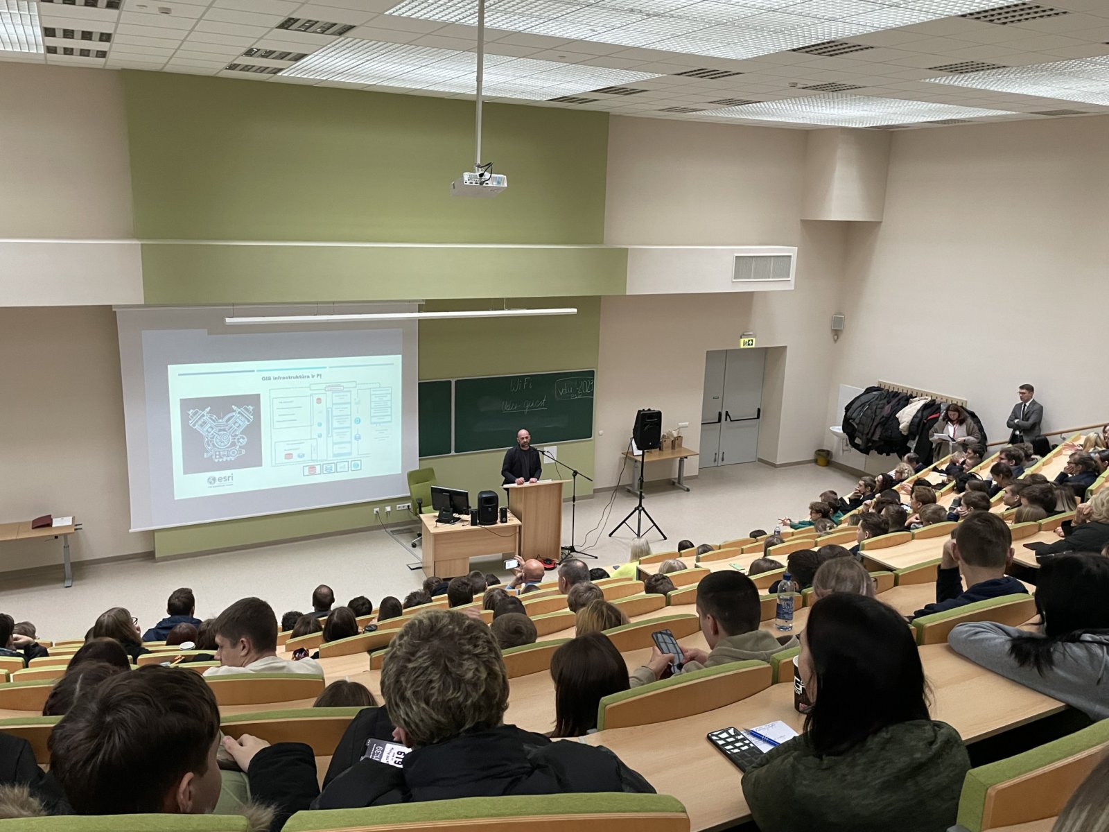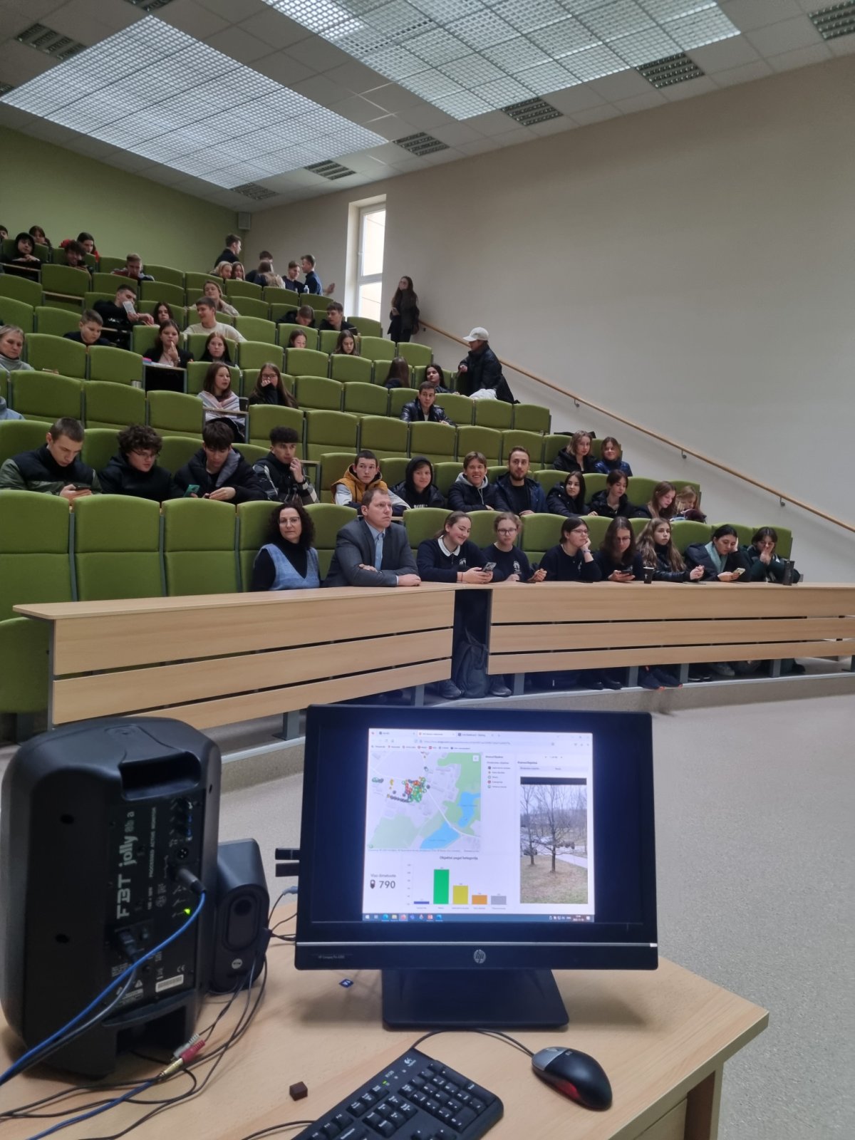 Klausantis Kauno SĮ „Kauno planas“ GIS vadovo Arūno Sipavičiaus moksleiviai sužinojo, kokie GIS sprendimai taikomi Kauno mieste. Kviestinis svečias supažindino auditoriją su įmonės geoinformacinių sistemų projektavimo, kūrimo ir priežiūros veikla, Kauno miesto GIS infrastruktūra, GIS technologijų taikymo sprendimais, kurie yra reikalingi bei naudingi miesto tvarkymo, nekilnojamo turto ir kitose srityse. VDU ŽUA lektorius, UAB „Hnit-Baltic“ projektų vadovas dr. Giedrius Pašakarnis moksleivių žinias taip pat papildė ne tik GIS taikymo sričių pavyzdžiais, bet ir suteikė jiems galimybę praktiškai išbandyti GIS veikimo principus, naudojantis specialia GIS programėle „ArcGIS“ mobiliuosiuose įrenginiuose. Gavę užduotį moksleiviai skubėjo į lauką skaitmeninėje erdvėje fiksuoti GIS objektų – medžių, vėliavos stulpų, apšvietimo stulpų, viešojo transporto stotelių, kelio ženklų. Per mažiau nei 30 minučių moksleiviai sužymėjo daugiau nei 850 objektų.