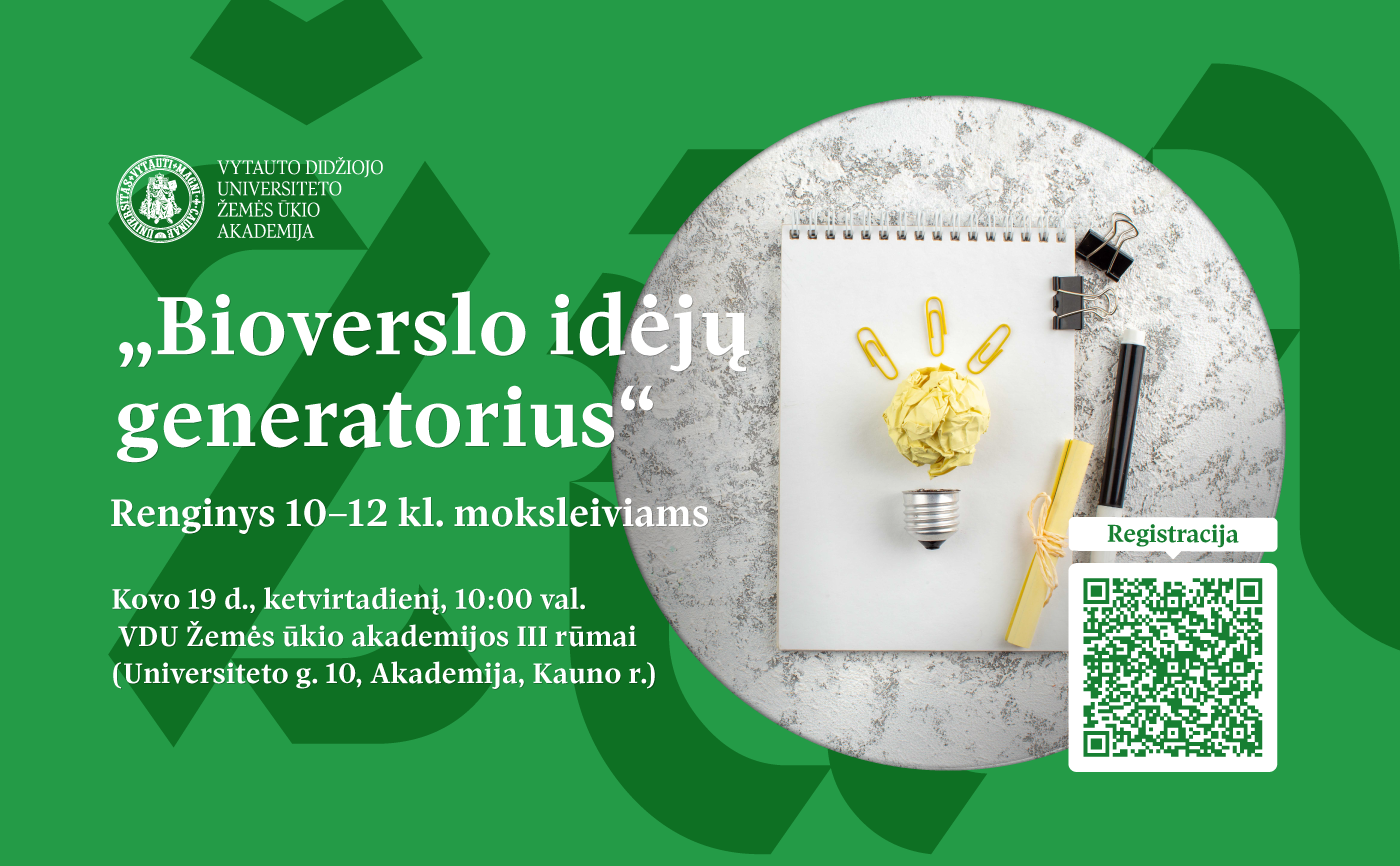 Visus žingeidžius, siekiančius tobulėti ir stiprinti verslumo įgūdžius 10-12 klasių moksleivius kviečiame pažadinti kūrybiškumą renginyje moksleiviams „Bioverslo idėjų generatorius“! Vytauto Didžiojo universiteto Žemės ūkio akademijos (VDU ŽŪA) Bioekonomikos plėtros fakulteto organizuojamas renginys vyks kovo 19 d. 10 -13 val. VDU Žemės ūkio akademijoje. Moksleivius kviečiame susiburti į komandas po 5-6 asmenis ir registruotis. Išankstinis pasiruošimas nebūtinas – atsivežkite gerą energiją, atviras mintis kūrybai, prisiminkite turimas verslumo, ekonomikos žinias ir visos bioverslo idėjos gims renginio metu! Bioverslo idėjų generatorių vainikuos skanios vaišės.