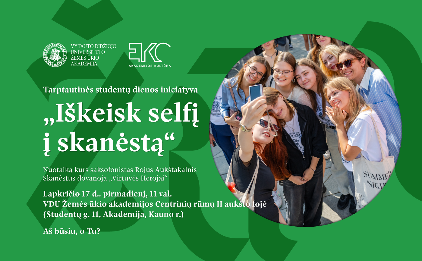Lapkričio 17 dieną 11 valandą visi studentai kviečiami į Tarptautinės studentų dienos renginį „Iškeisk selfį į skanėstą“, kuris vyks Vytauto Didžiojo universiteto Žemės ūkio akademijos (VDU ŽŪA) Centrinių rūmų II aukšto fojė (Studentų g. 11, Akademija, Kauno r.).