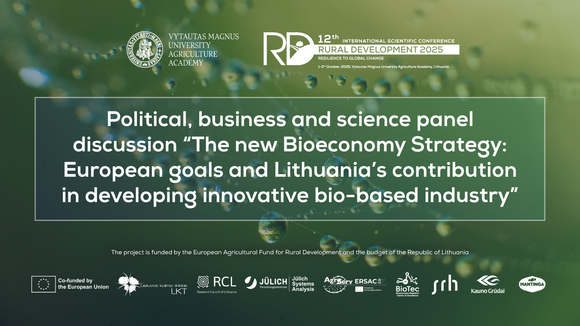 Spalio 1 d. 14:30 val. maloniai kviečiame klausyti Vytauto Didžiojo universiteto Žemės ūkio akademijoje (VDU ŽŪA) tarptautinės mokslinės konferencijos „Kaimo plėtra 2025: atsparumas globaliems pokyčiams“ metu vykstančios politikos, verslo ir mokslo panelinės diskusijos „Naujoji bioekonomikos strategija: Europos tikslai ir Lietuvos indėlis plėtojant inovatyvią bio-pramonę“.