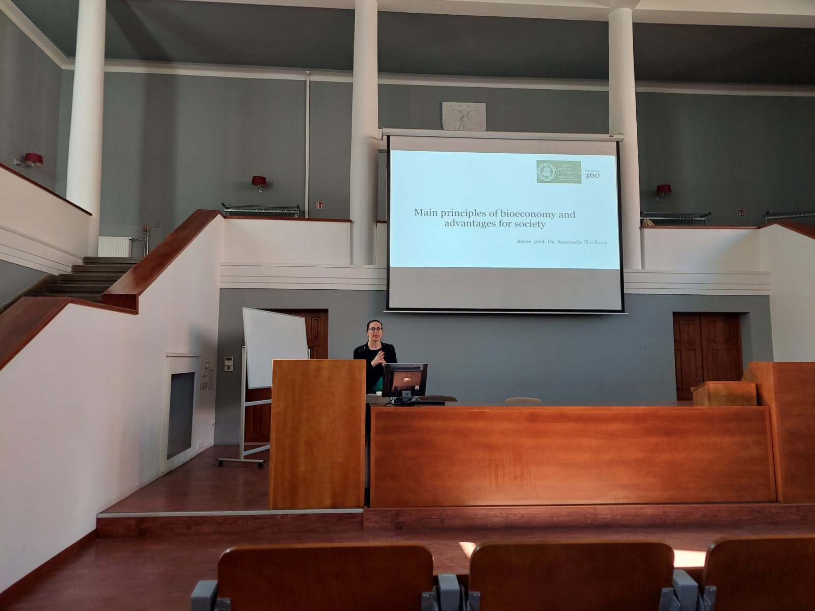 Doc. dr. Anastasija Novikova skaitė paskaitas apie bioekonomikos pagrindus ir privalumus visuomenei, sutelkusi dėmesį į aplinkos problemas. Su studentais ji pirmiausiai apžvelgė aplinkosaugos veiksmų programų istoriją nuo jų pradžios iki Europos Žaliojo kurso įgyvendinimo, aptardama pagrindinius tikslus. Taip pat studentams paaiškino Bioekonomikos strategiją, atskleisdama bioekonomikos plėtros svarbą, pagrindines bioekonomikos sąvokas iš skirtingų perspektyvų, aptarė pagrindinius bioekonomikos principus. Galiausiai studentai aktyviai dalyvavo interaktyviame žinių įvertinimo žaidime apie bioekonomiką ir aplinkos problemas, kurį studentai sėkmingai įvykdė.