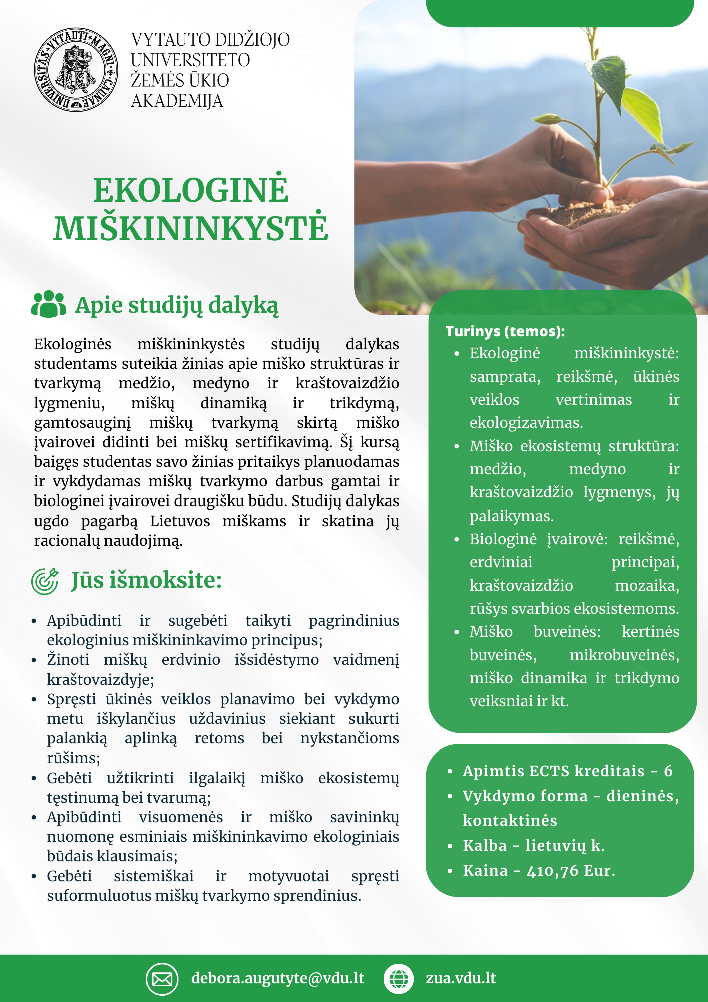 VDU Žemės ūkio akademija skelbia registraciją į dalykų studijas ir rudens semestre kviečia rinktis iš 26 studijų dalykų bei tapti studentu – laisvuoju klausytoju. Siūloma rinktis programas iš agronomijos, bioekonomikos plėtros, inžinerijos, miškininkystės ir ekologijos sričių. Laisvuoju studijų dalykų klausytoju gali tapti visi, kurie nori tobulėti bei kelti savo kvalifikaciją.