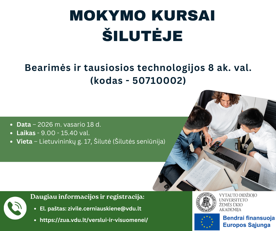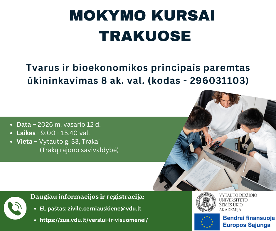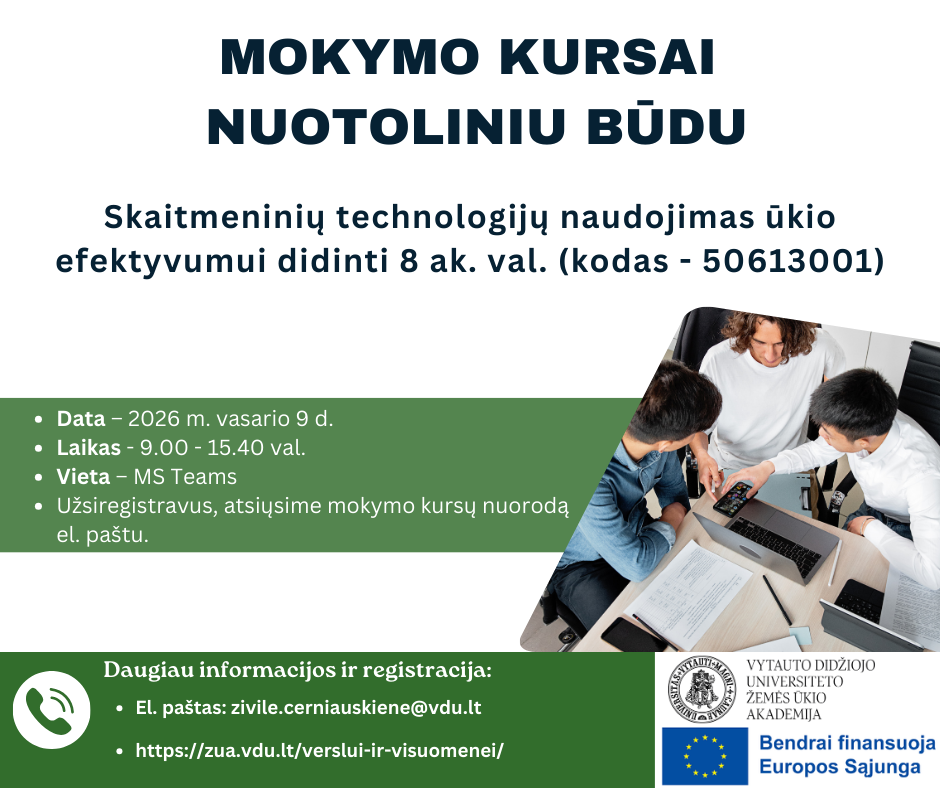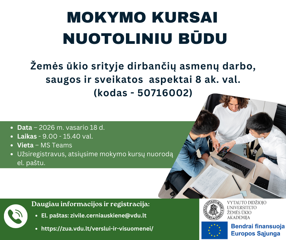 Vytauto Didžiojo universiteto Žemės ūkio akademija kviečia į nemokamus mokymo kursus: