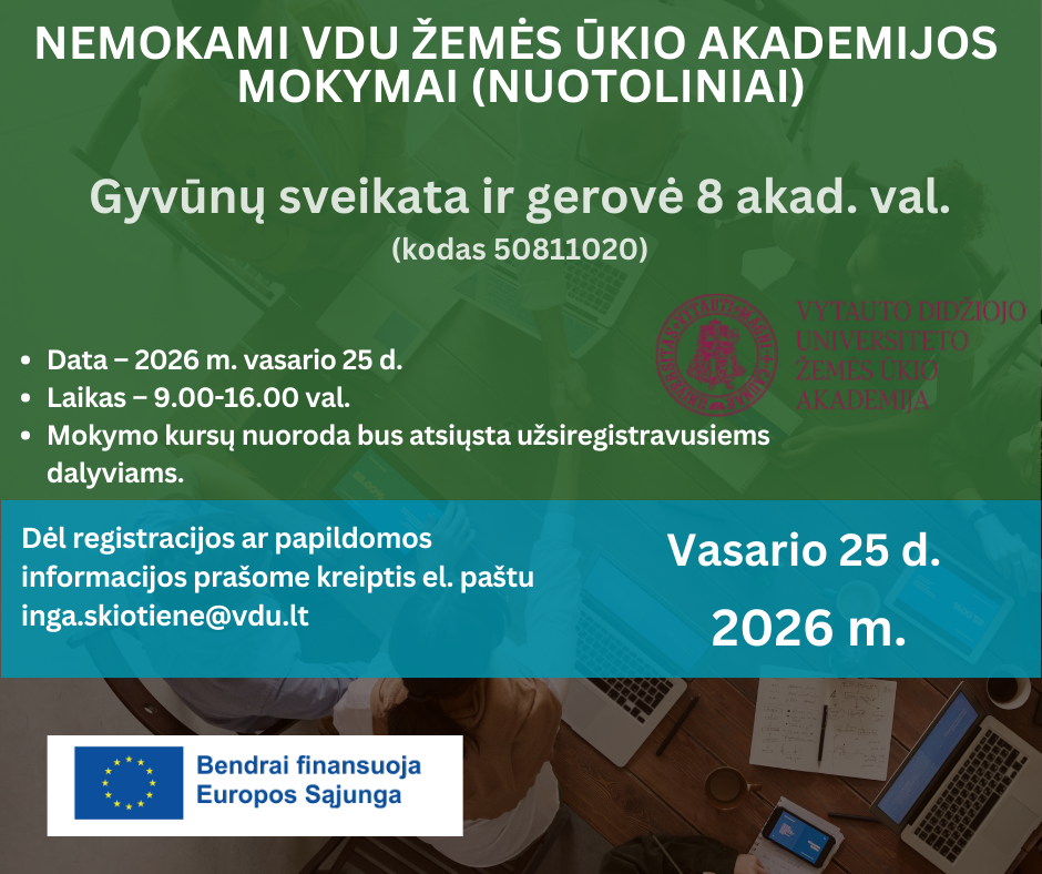 - Vasario 25 d., Gyvūnų sveikata ir gerovė, 8 ak. val. (kodas – 50811020), (Nuotoliniu būdu)