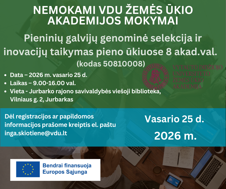 - Vasario 25 d., Pieninių galvijų genominė selekcija ir inovacijų taikymas pieno ūkiuose, 8 ak. val. (kodas – 50810008), Jurbarko r.