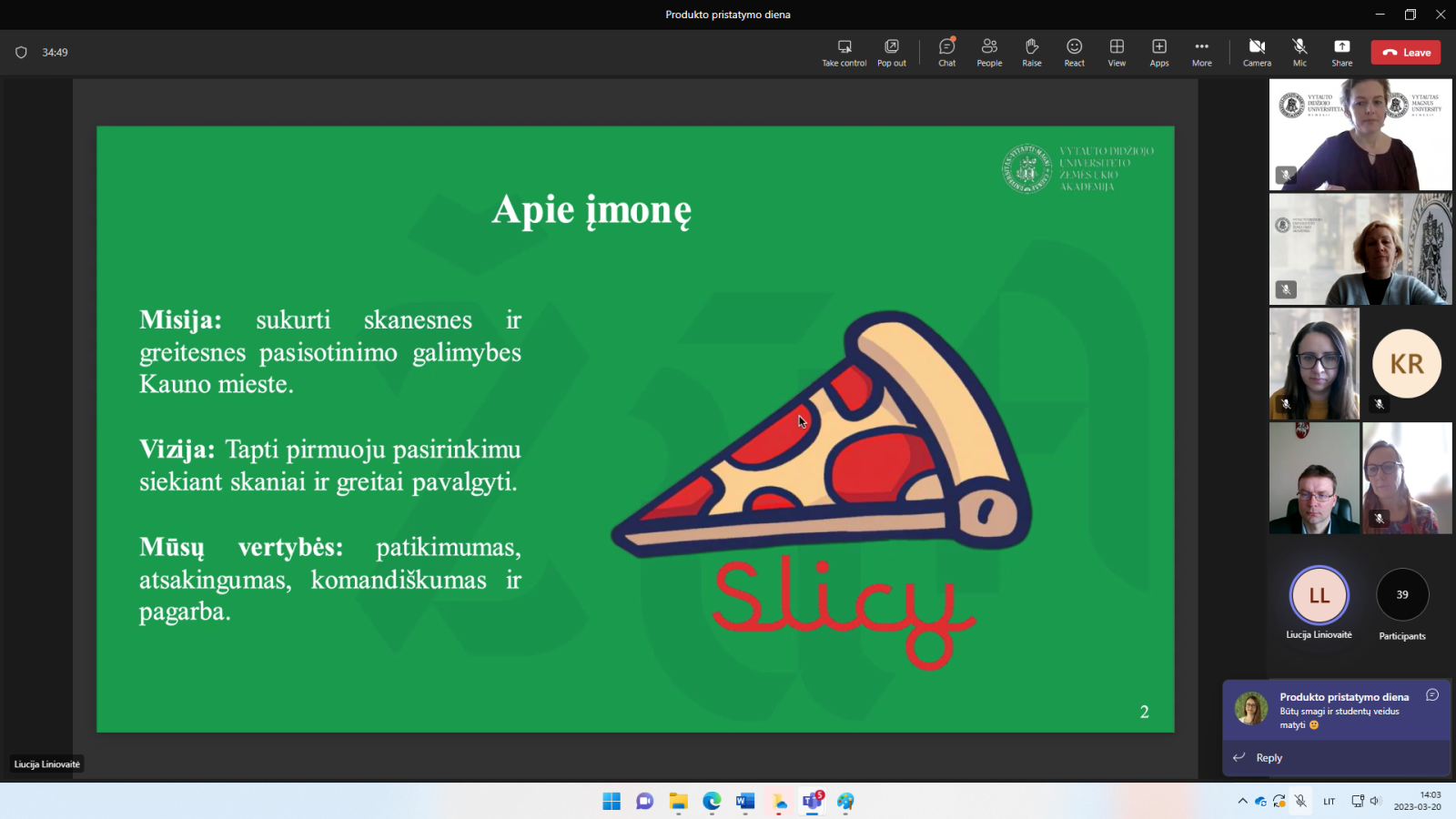 Vytauto Didžiojo universiteto Žemės ūkio akademijos (VDU ŽŪA) Bioekonomikos plėtros fakulteto 3 ir 4 kurso studentai Verslumo ugdymo studijų dalyke kovo mėnesį kūrė verslo idėjas ir produktus. Trys studentų grupės – įkurtos imitacinės įmonės „Verslauk1“, „Verslauk2“ ir „Verslauk3“ – Produkto pristatymo dienos renginyje dėstytojoms-mentorėms, kolegoms ir fakulteto dėstytojams bei administracijos atstovams pristatė savo idėjas ir produktus, kuriuos, padedami Verslumo ugdymo studijų dalyko dėstytojų-mentorių, išvystė paskaitų metu.